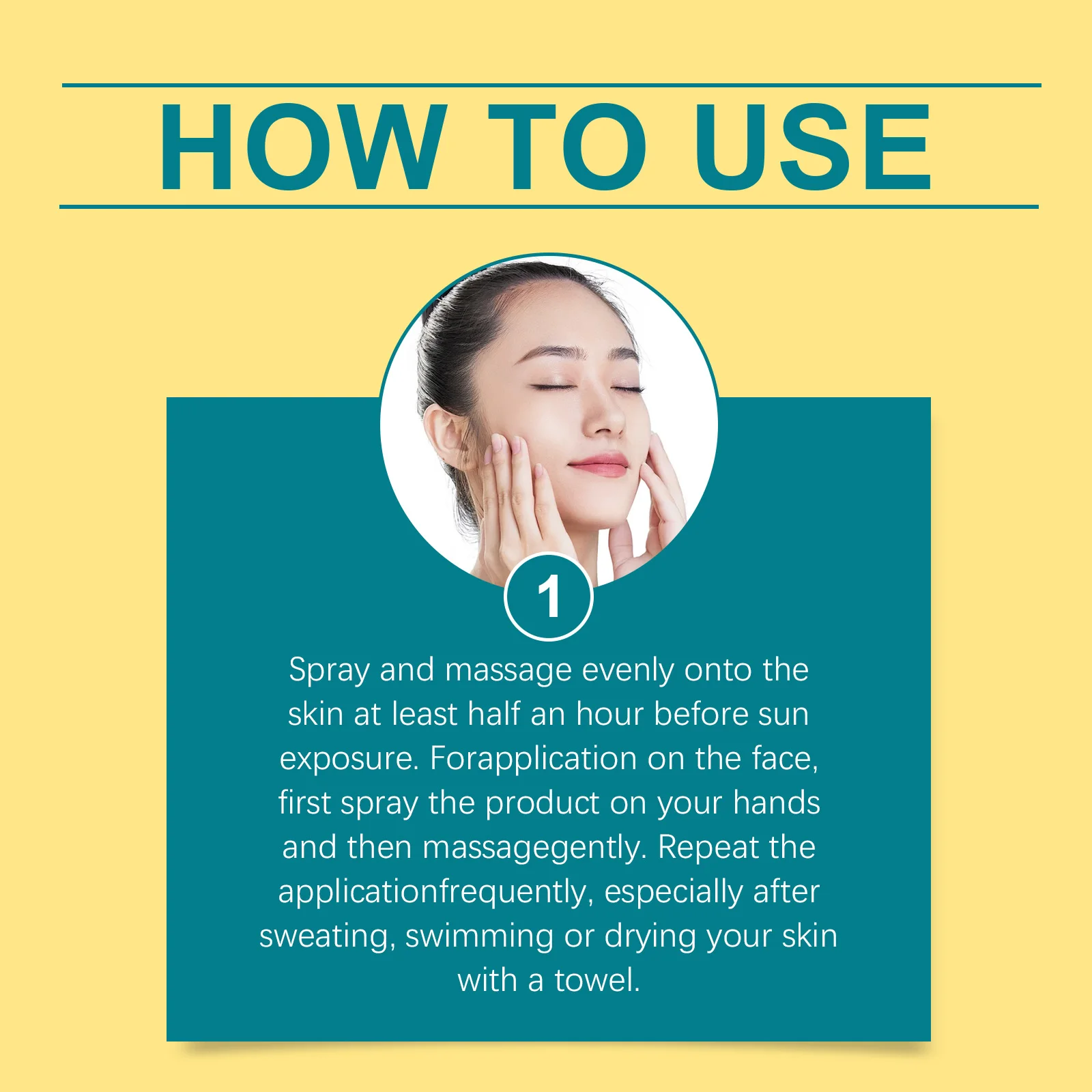 Spray and massage evenly onto the skin at least half an hour before sun exposure. Forapplication on the face, first spray the product on your hands and then massagegently. Repeat the applicationfrequently, especially after sweating, swimming or drying your skin with a towel.