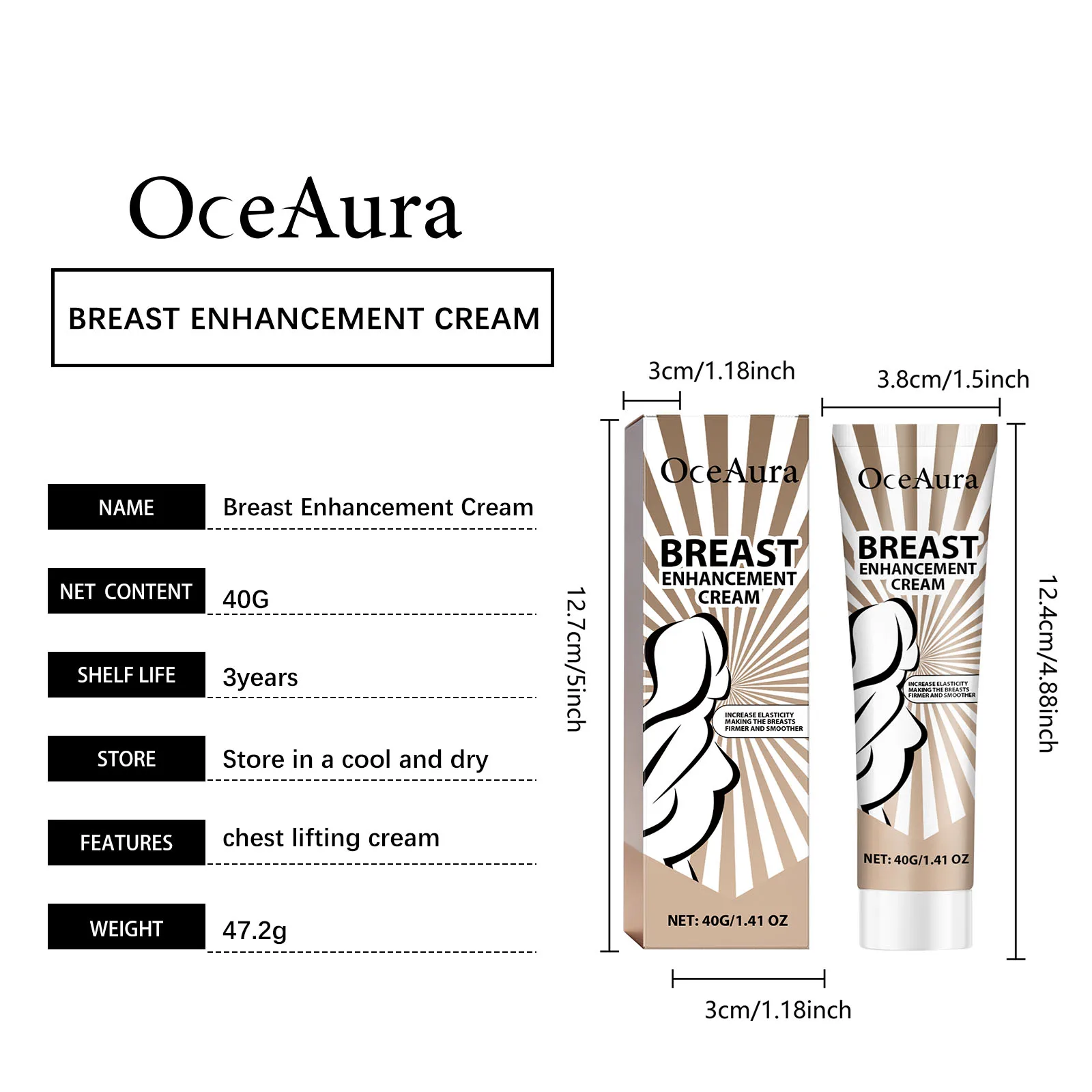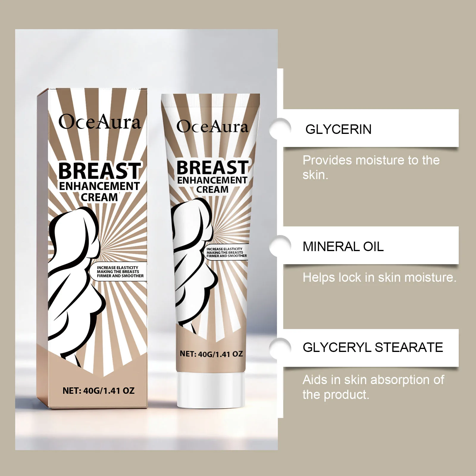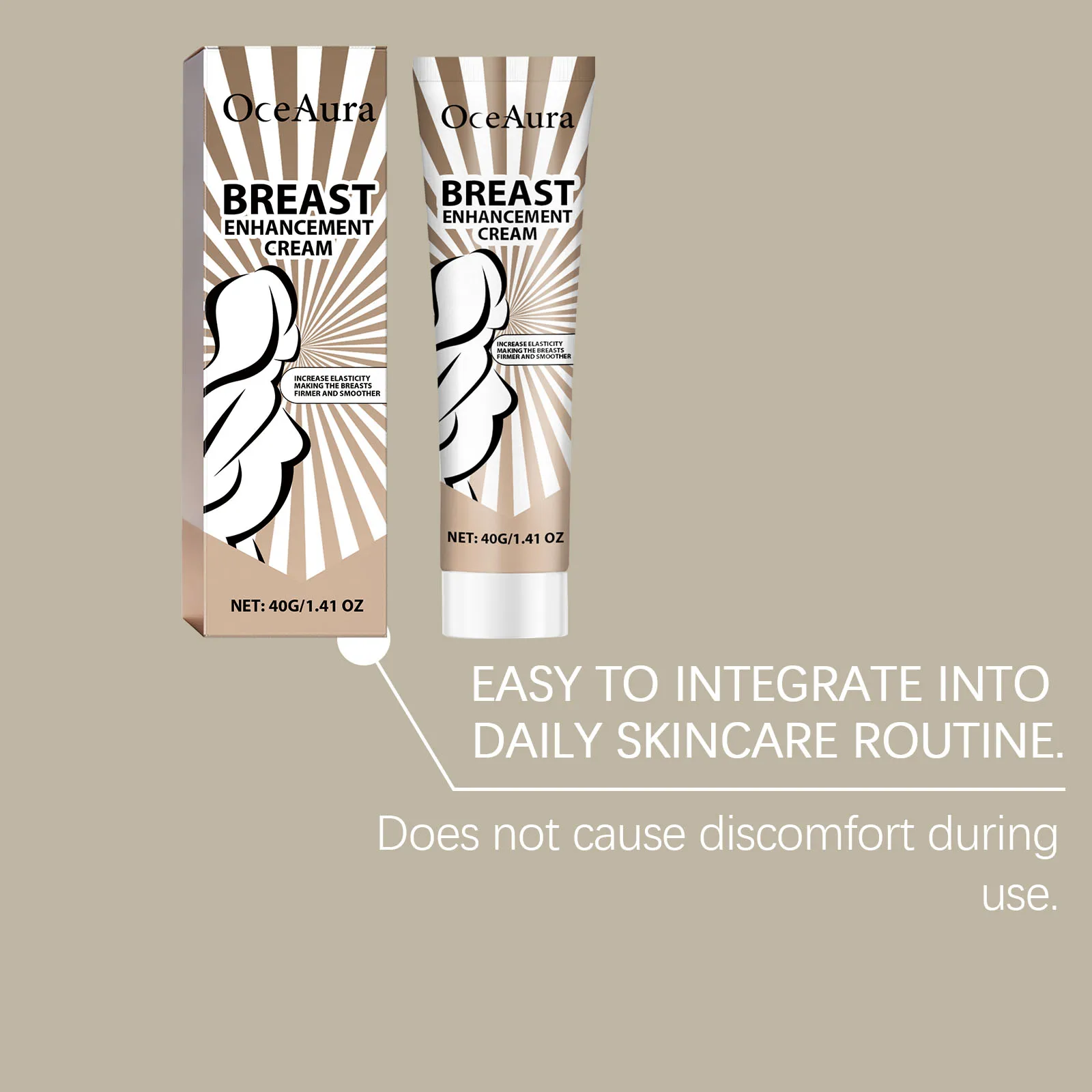 Precautions: For external cosmetic use on intact skin only. NOT INTENDED TO ALTER BREAST SIZE OR STRUCTURE. Avoid eyes, nipples, and broken skin. Discontinue if irritation occurs.