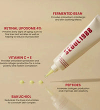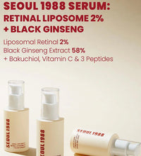 2.1988 Retinal Serum features 2% Retinal Liposome to combat fine lines, wrinkles, and uneven texture while reducing oil production. Black Ginseng Extract provides antioxidant protection. Bakuchiol, Vitamin C, Niacinamide, and three peptides enhance collagen production and improve elasticity for a noticeable anti-wrinkle effect. Tocopherol retains moisture, keeping skin hydrated and radiant.