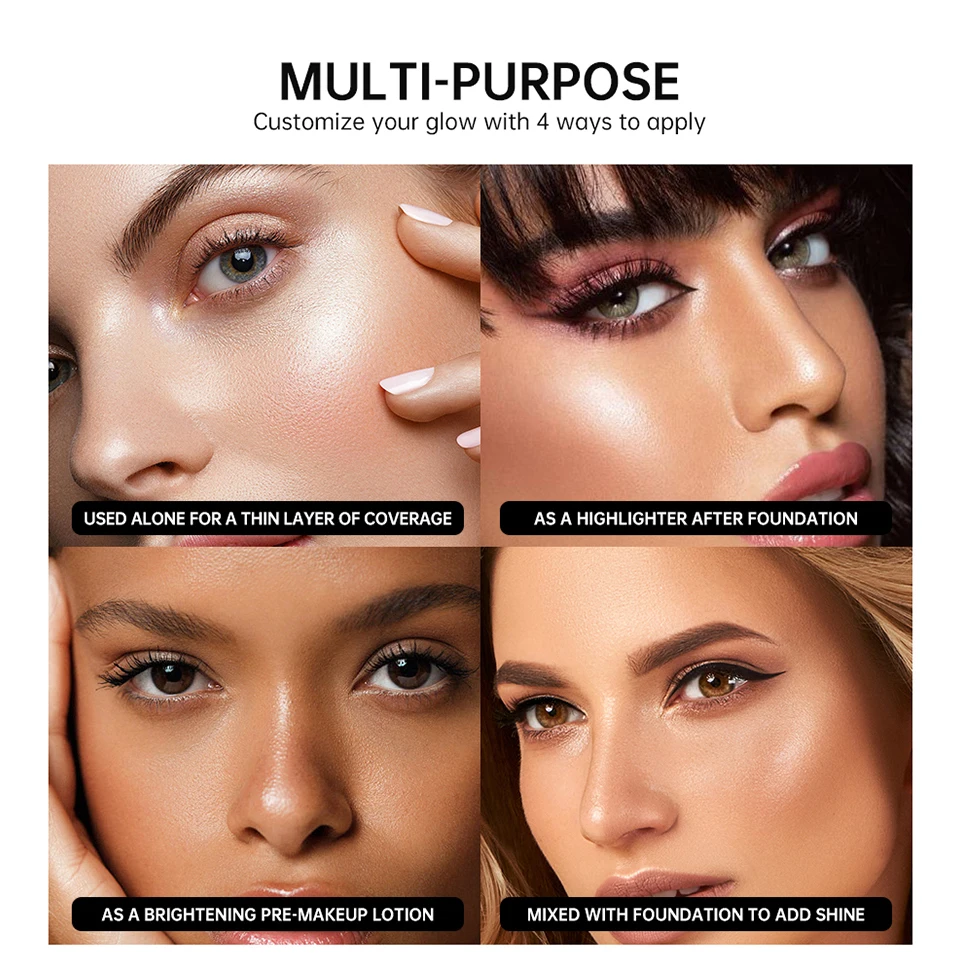 5Multiple uses, can be used alone for a thin layer of coverage, as a highlighter after foundation, as a brightening pre-makeup lotion, and of course, can be mixed with foundation to add shine.