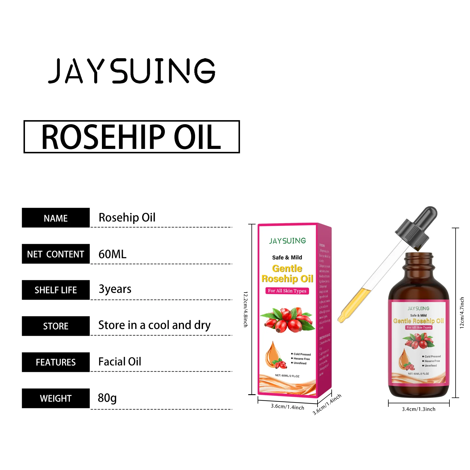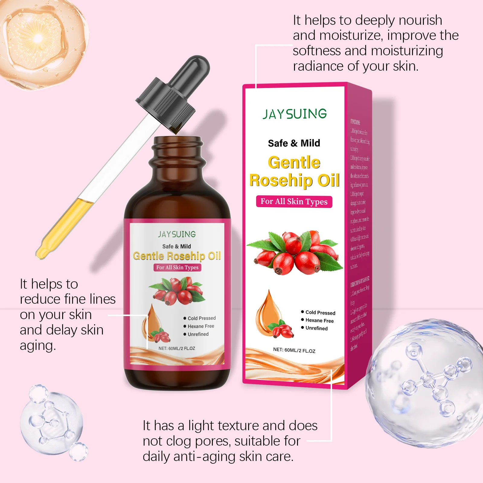 JAYSUING Rosehip Oil for Face Organic Anti-Aging Acne Scar Treatment Fade Fine Line Lifting Firming Moisturizer Wrinkle Reduction Essence 60ml